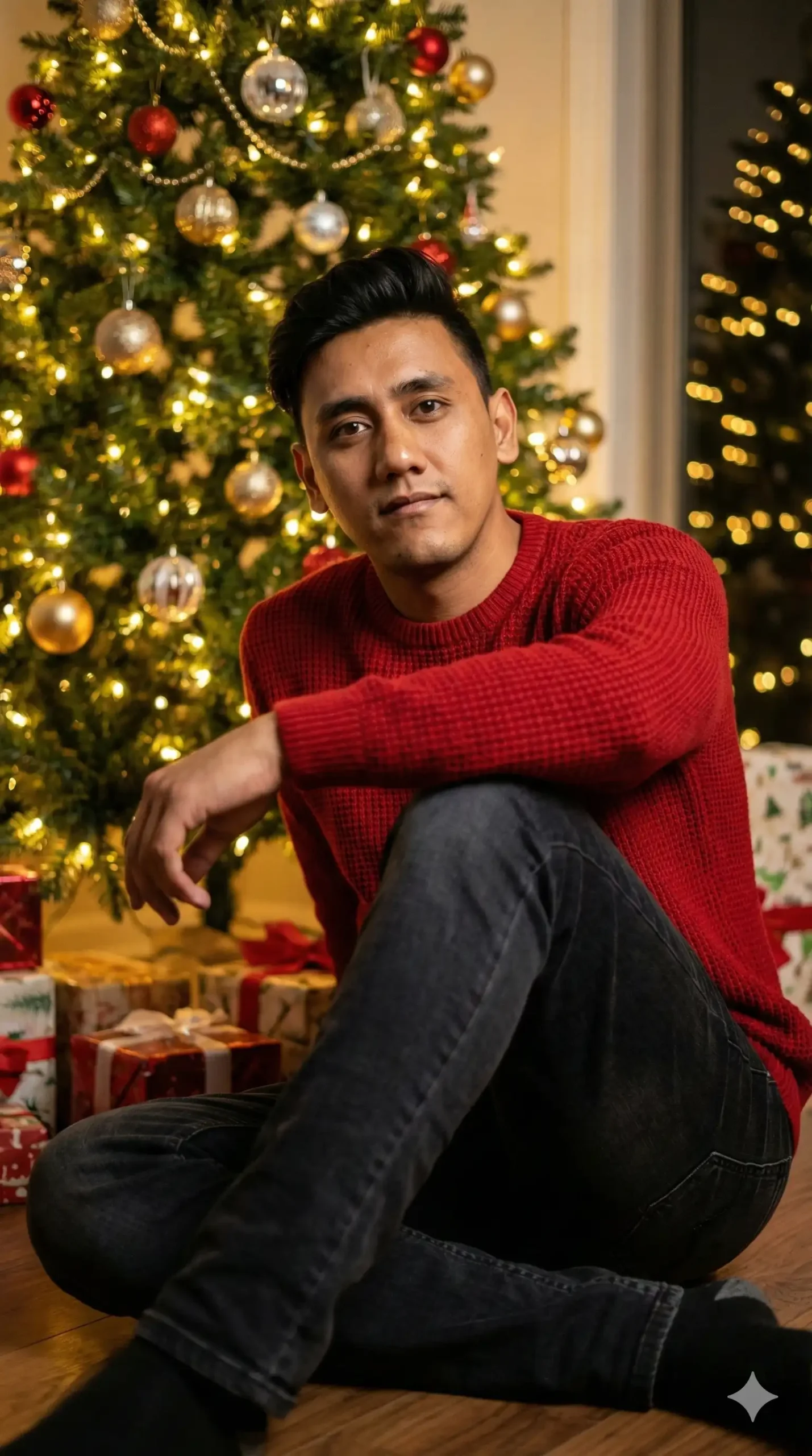 A cinematic, hyper-realistic 16K portrait of a person (USE PROVIDED PHOTO REFERENCE FACE). The subject is sitting comfortably on the floor near a grand, brightly lit Christmas tree, surrounded by wrapped gifts. The person is striking a confident, relaxed pose, looking directly at the camera with an engaging expression. They are wearing sophisticated red casual fashion attire (e.g., a knit sweater or velvet top). The lighting is soft and warm, capturing the glow of the tree lights reflecting in the background bokeh. Shot with a Canon EOS camera, using a 50mm prime lens. Ultra-detailed, photographic quality, rich depth of field.