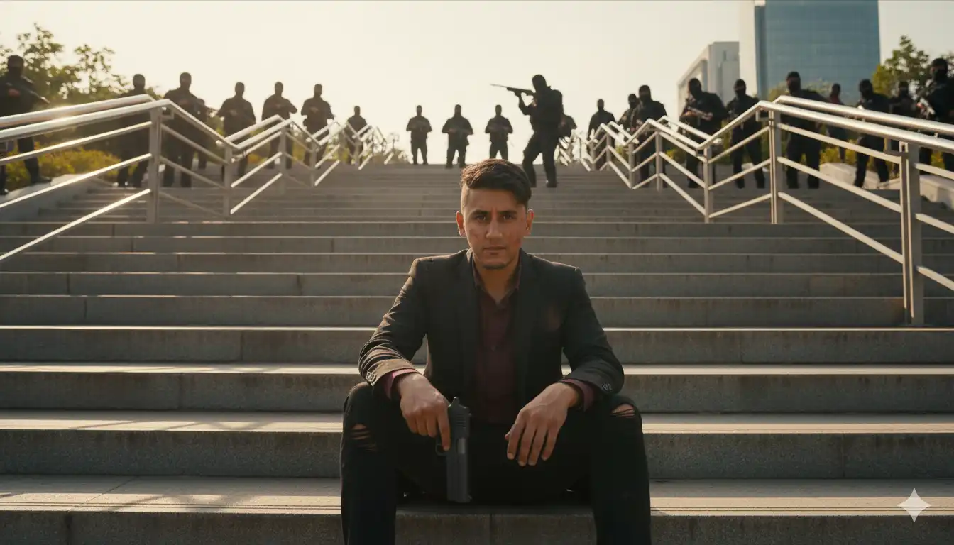 Create Photorealistic cinematic shot of a young man (give photos), sitting tiredly on a large, modern outdoor concrete staircase with three layers of luxury flat metal railings in an urban park. He was obviously injured, his dark suit was dirty and ripped. He got the gun tight in his right hand. Looking forward with intense determination. A group of dozens of armed assailants were standing at the top of the stairs, looking down, and were aiming a shotgun directly at him from a distance. Light is the afternoon sunlight that gives a sense of dramatic, highly detailed, ultra realistic.
