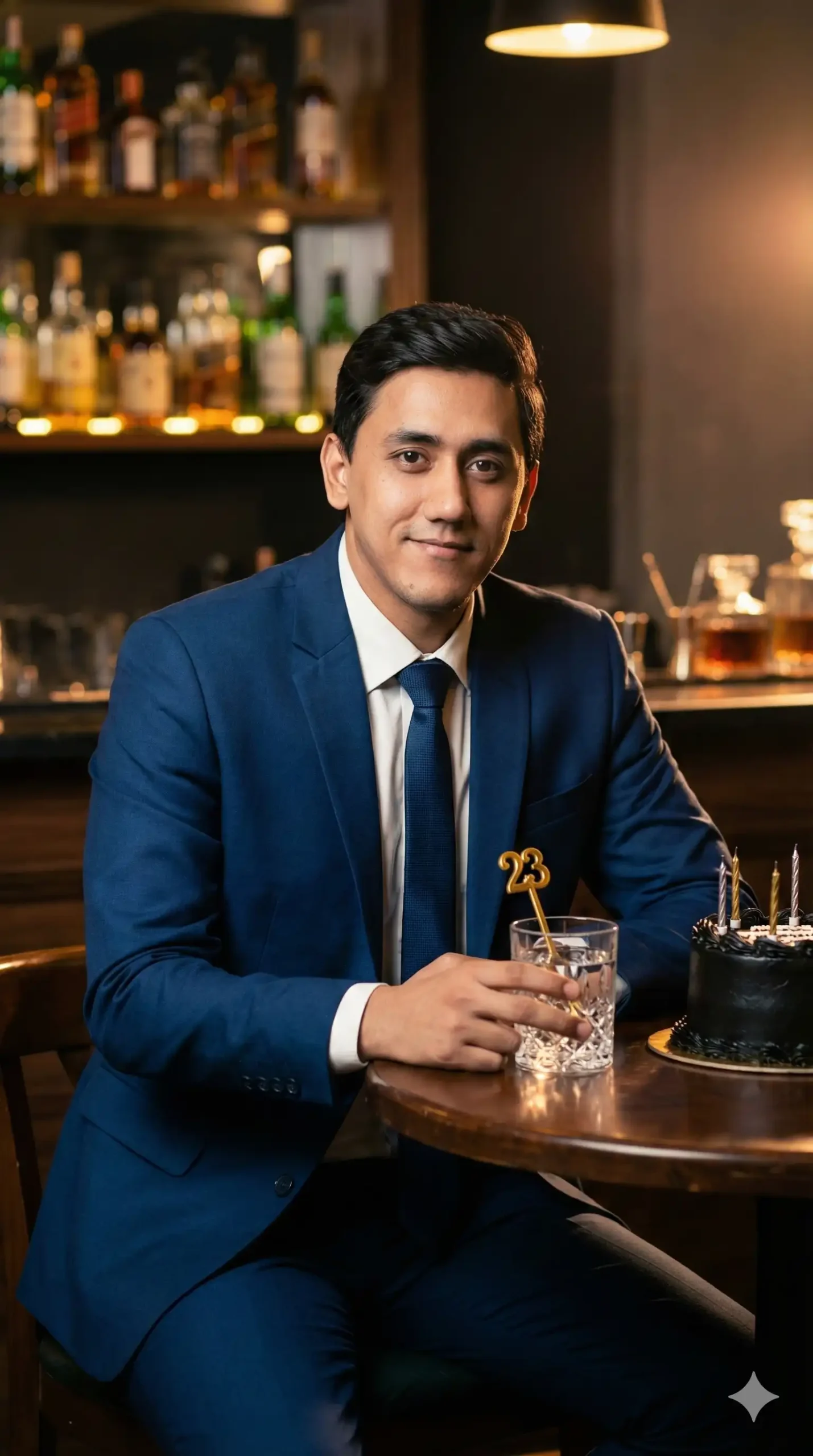 A sophisticated portrait of the young man seated at a dark wooden bar table, dressed in a tailored deep-blue suit and tie. He holds a crystal glass of water with a golden '23' stirrer inside. A small black birthday cake sits beside him. Background features warm bar lights and blurred shelves of bottles. Moody cinematic lighting.
