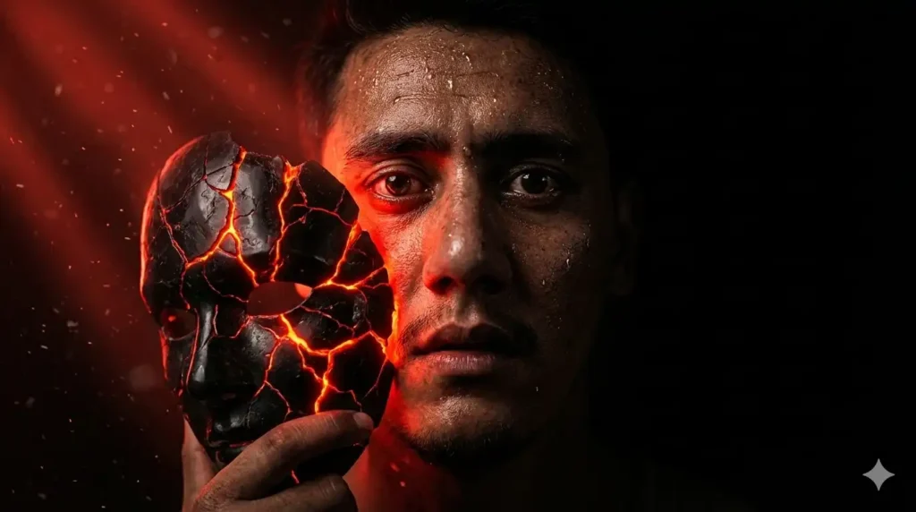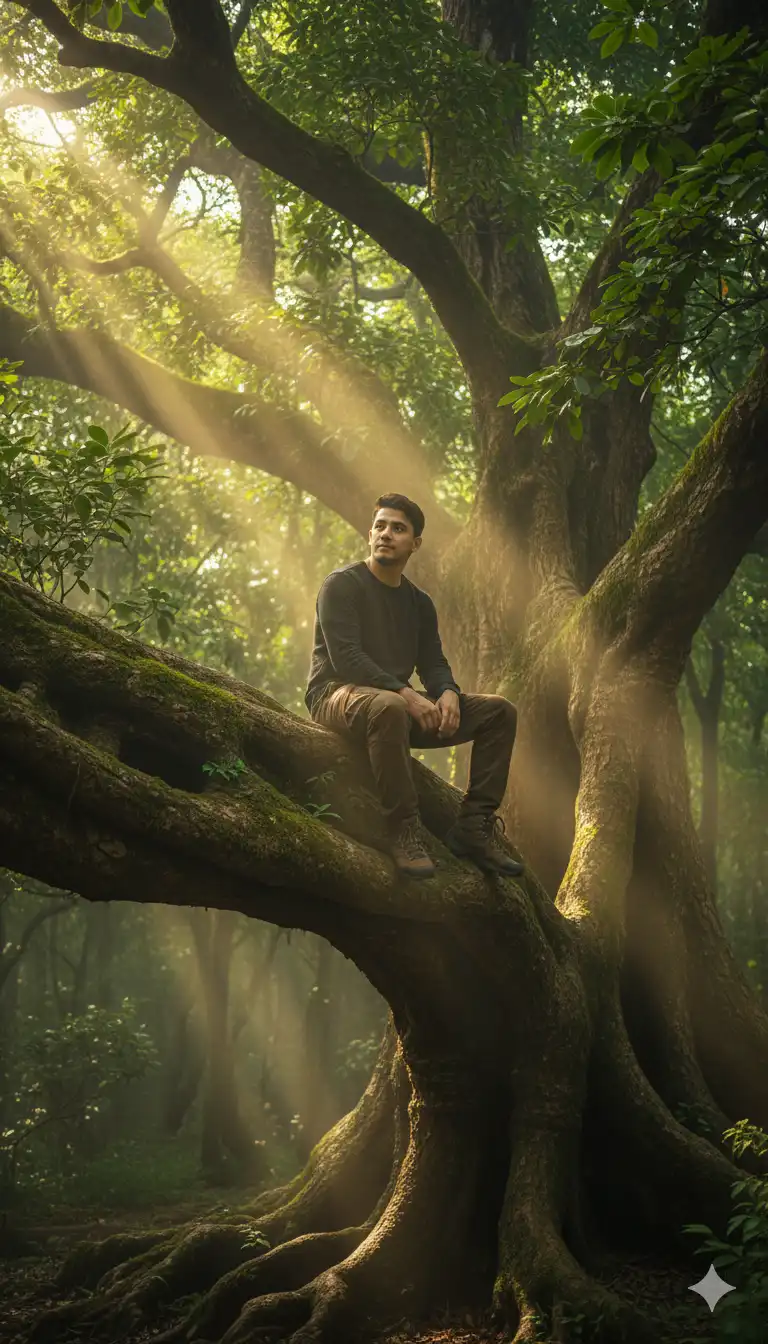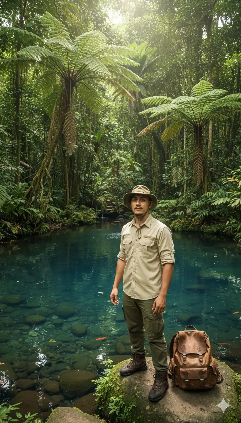 A high-resolution, cinematic photograph of a young boy standing near a small, crystal-clear pond in the middle of a dense jungle. The water is extremely clean and appears deep blue-green, revealing the ground and stones clearly beneath the surface. The man is wearing a jungle traveling dress up. Looking towards camera.