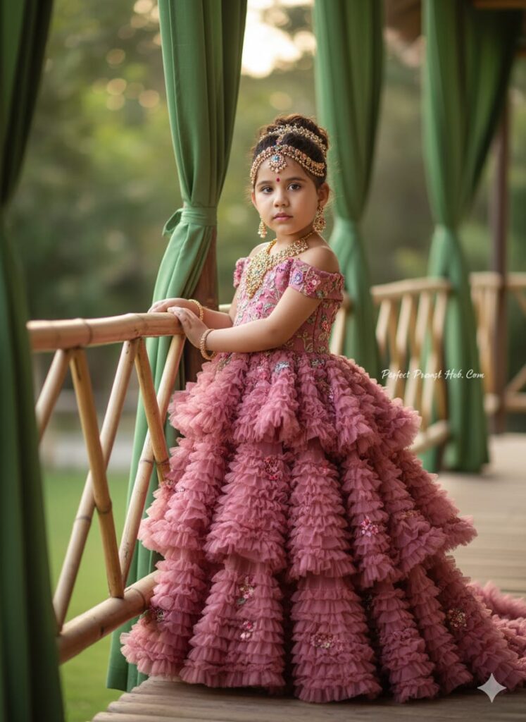 A little girl posing gracefully beside a bamboo railing, wearing an elegant, floral-inspired outfit in deep rose-pink tones made of layered, ruffled fabric. She has intricate gold jewelry — a large necklace, earrings, and headpiece — inspired by traditional Indian bridal design. The lighting is soft and warm, with a dreamy background of green curtains and blurred garden plants, creating a serene and regal atmosphere. The image is bright, detailed, and high-quality fashion photography.