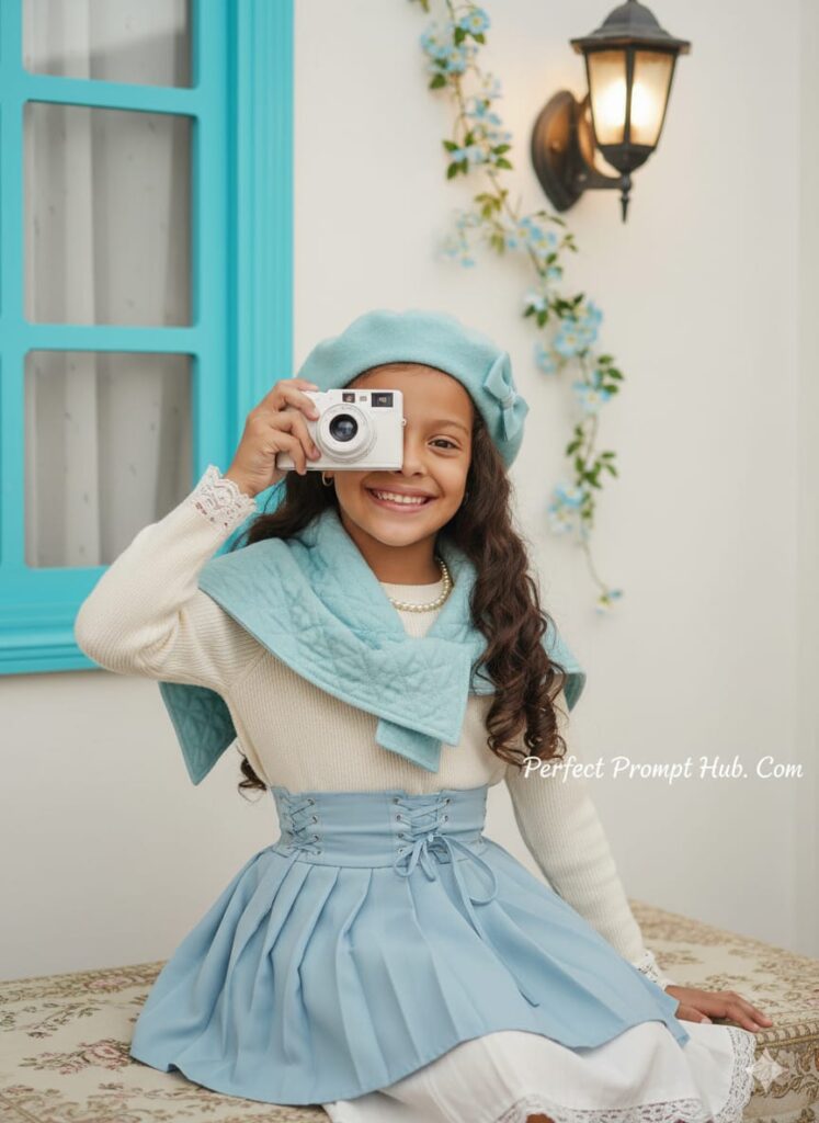 Create an image using the uploaded photo, features a young girl, likely of Asian descent, sitting down and holding a white, retro-style camera as if about to take a picture. She is smiling genuinely at the camera. 📸 Outfit and Styling She is wearing a charming outfit with a soft, pastel blue and cream color palette. Her top is a cream or off-white long-sleeved sweater with delicate lace trim at the cuffs and hem. The bottom half consists of a pleated, light blue skirt with a corset-style lace-up detail at the waist, worn over a white underskirt. She is accessorized with a light blue beret that has a bow, a pearl necklace, and a quilted, light blue scarf or shawl draped around her neck and shoulders. She has long, dark, wavy hair. 🖼️ Background and Setting The background creates a whimsical and soft vintage or European-inspired scene, predominantly in shades of white, cream, and soft blue. To her left is a window frame painted in a vibrant light blue. Above and to her right is an antique-style wall lantern emitting a warm, soft glow. A vine with light blue and white flowers is draped along the wall near the lamp. She is sitting on a patterned rug or blanket that features floral designs. The overall mood of the photo is bright, sweet, and enchanting.