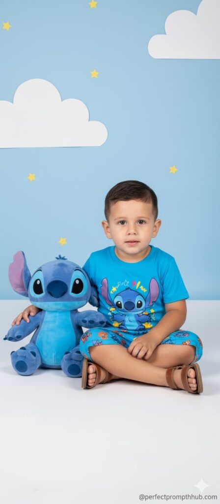 Subject: A young boy with dark, short hair. He is sitting cross-legged. Clothing: He is wearing a bright blue t-shirt and shorts set with a Lilo & Stitch print. The t-shirt features a large image of Stitch. He is wearing brown leather sandals. Setting and Composition: The boy is sitting on the floor or a white surface. He is accompanied by a large Stitch plush toy, almost as big as he is, placed to his left. The boy rests his right arm on the plush toy. The background is a light sky-blue studio backdrop decorated with large, cartoon-style white clouds and scattered small yellow stars. Pose and Expression: The boy is looking directly at the camera with a calm expression and a slight smile. His pose is relaxed.