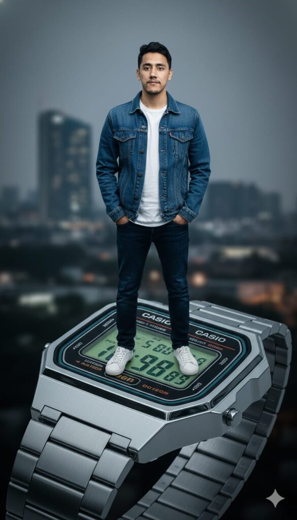 Realistic 8K image of me (use reference photo, slim build) standing on a Casio vintage digital watch, metallic silver with retro LCD display. I'm dressed in a denim jacket, white T-shirt, dark jeans, and sneakers, hands in pockets, relaxed modern city vibe. The watch face glows slightly green from the digital display, reflections on the metallic bracelet, slight vignette effect, ultra-realistic lighting, high detail on fabric and reflections. In a clam mode