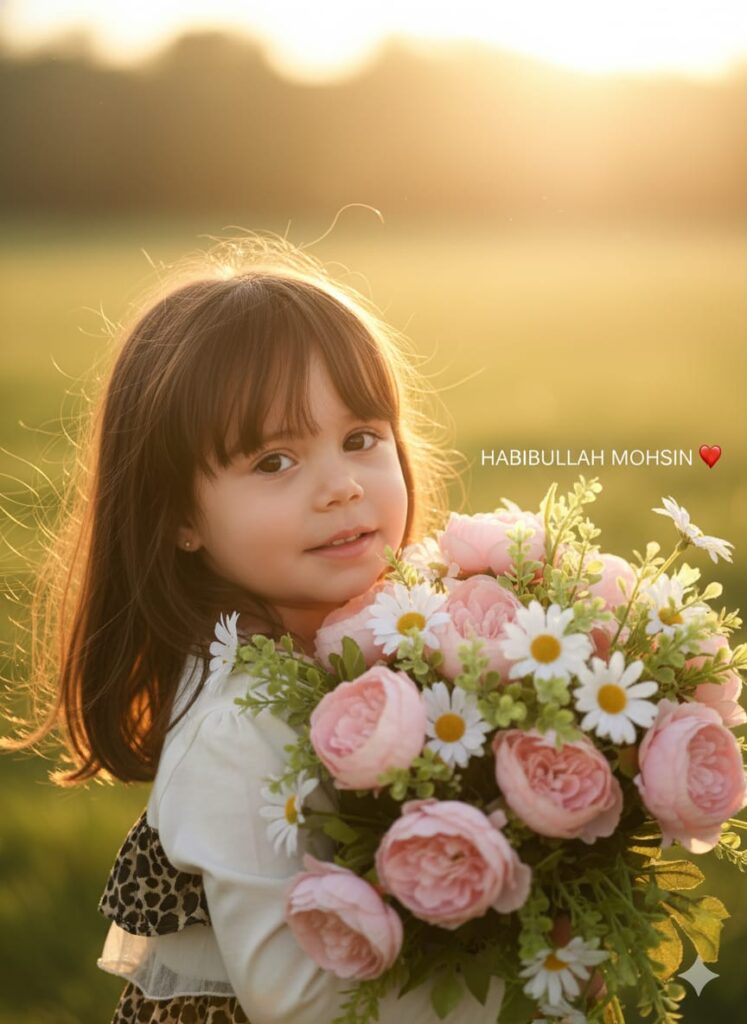 Full body. A 3-year-old girl. Do not alter her face or hairstyle. Create an ultra-realistic and glamorous cinematic image. Copy the girl's face 100% in a medium close-up, framed from the chest up, with the girl slightly in profile, turned away from the camera, and her face gently turned toward the viewer. The camera angle is slightly low, pointing upwards over the girl, with a luminous early morning sunset background. The girl stands upright, holding a large, dense bouquet of pale pink, multi-petaled flowers, white daisy-like blooms, and abundant light green foliage near her left shoulder and chest. Her head is slightly tilted, and she gazes at the camera with a sweet expression and slightly parted lips. Fine strands of medium-black hair with warm golden undertones, illuminated by a subtle backlight, frame the face and seem to ripple in the breeze, gently shifting to the left.