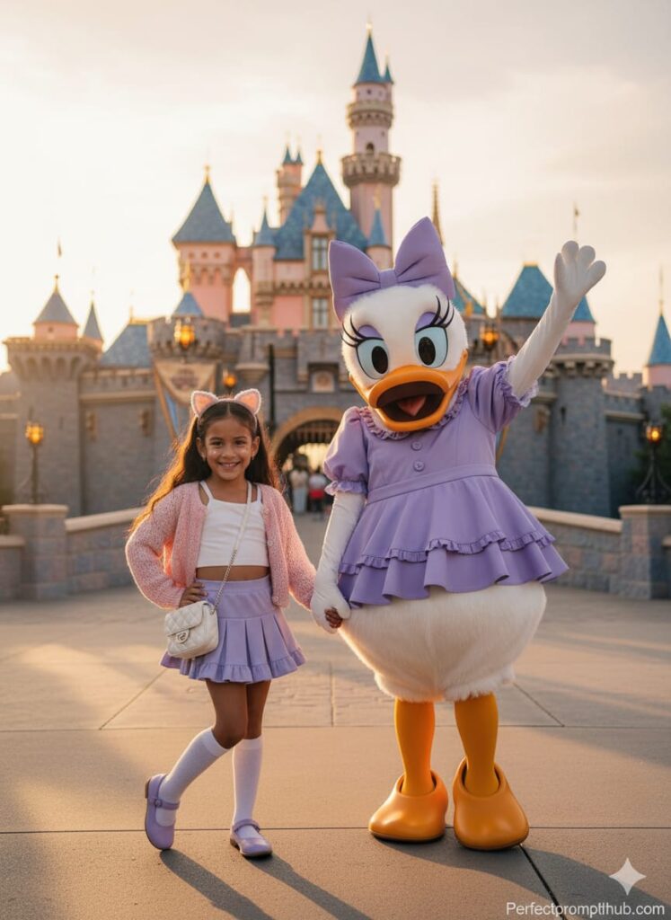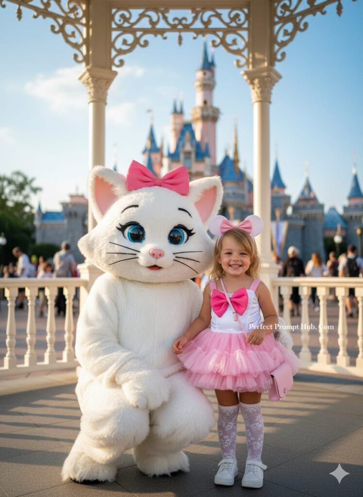 Create ultra-realistic cinematic glamour image 100% copy of a 3 year old girl wearing simple make up(using this uploaded photo)Do not change her face 100% close up Portrait ,copy her exact facial features,A little girl and a person in a white cat costume pose together outdoors. The girl has long, wavy black hair and is wearing a white bustier top with a pink bow, a short ruffled pink skirt, white lace-patterned knee-high socks, and white sneakers. She also has a pink purse and white mouse ears on her head. The cat costume is white with a large pink bow on its head and has blue eyes. They are standing under a white gazebo with decorative pillars. In the background, a large fairytale castle with blue turrets and pink accents is visible under a clear sky. There are other people blurred in the background, suggesting a theme park setting. The lighting is soft and golden, characteristic of afternoon or early morning.