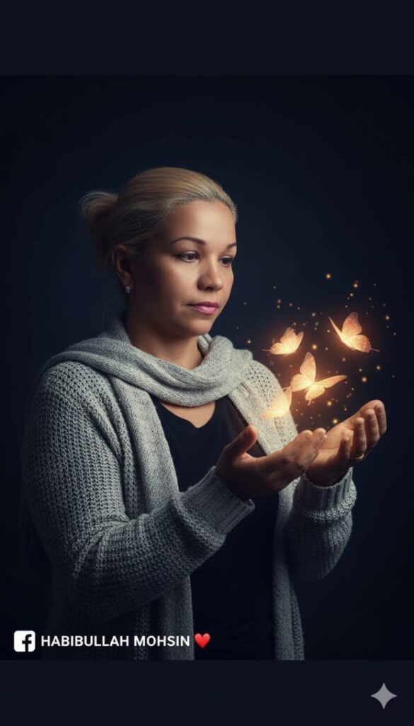 Buatkan fotografi Fantasi Realistis dengan nuansa gelap, magis, dan bercahaya lembut, mengunakan gambar referensi. Deskripsi Subjek: Ekspresi wajahnya tenang, fokus, dan sedikit melamun, menatap lembut ke arah tangannya. Dia mengenakan sweater rajutan berwarna abu-abumuda yang sangat bertekstur berlapis dia atas kaos hitam polos, dan phasmina abu-abumuda. fostur: Setengah badan, dengan kedua tangan terbuka dan diangkat setinggi dada, seolah-olah sedang memegang atau berinteraksi dengan kupu-kupu. Pencahayaan & Suasana: Pencahayaan low-key yang dramatis. Latar belakang sangat gelap (biru tua pekat atau hitam), menciptakan kontras tinggi. Sumber cahaya utama berasal dari kupu-kupu, memberikan cahaya keemasan atau oranye-kuning yang hangat dan bercahaya (glowing). Cahaya dari kupu-kupu ini memantul lembut (rim light atau fill light) pada kulit tangan, wajah, leher, dan bahu subjek, memberikan kesan magis dan eterik. Fokus tajam pada subjek dan kupu-kupu di dekatnya, dengan efek blur (bokeh) minimal atau tidak.