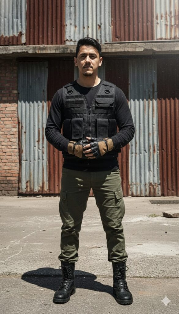 A raw and powerful, hyper-realistic 8K photography prompt features a male figure, "exactly face uploaded image 100%", standing with quiet confidence in a derelict industrial urban zone, against a backdrop of corrugated metal and faded brick under a harsh midday sun. The mood is gritty and resilient, ideal for a strong narrative Social Media Poster. The environment is characterized by strong, unfiltered sunlight creating stark contrasts between deep shadows and brightly lit surfaces, with dust motes visibly suspended in the air, adding to the atmosphere. Captured with a 50mm f/1.8 lens, the composition is a medium shot portrait, focusing on the subject's resolute expression and the texture of his attire, with the industrial elements forming a graphic, almost abstract background. The subject is dressed in a rugged 'Techwear' aesthetic: a durable, tactical utility vest over a dark long-sleeve shirt, heavy-duty ripstop cargo pants, and sturdy, black high-top boots. His hands are clasped loosely in front, revealing worn leather gloves. This image is masterfully designed for a powerful Photoshop Advertising Poster, offering rich potential for detailed Photoshop Photo Manipulation, and represents a benchmark for impactful Photoshop Graphic Design, achieving an uncompromising level of photorealistic detail.
