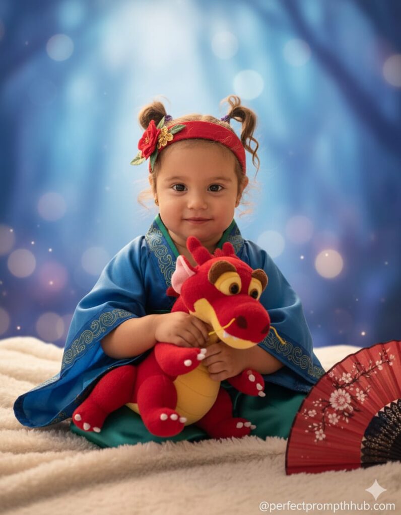 Create a Mulan-inspired image from this uploaded photo of a seated girl. She is dressed in a Mulan-inspired costume, with a blue and green dress with wide sleeves. On her head, she wears a red headband adorned with a delicate gold flower and green leaves. Cradled in her arms is a red Mulan dragon plushie, Mushu. She is sitting on a light-colored, fluffy blanket. To her right, a vibrant red fan with intricate black and white floral patterns is partially visible, adding a touch of Asian-inspired decor. The background is a soft, dreamy blue with subtle bokeh effects, suggesting a magical or ethereal setting. The lighting is soft and warm, enhancing the serene and enchanting atmosphere of the scene. Make it realistic using my photo as a facial reference. Signature: perfectprompthub.com Don't change her face and hair.