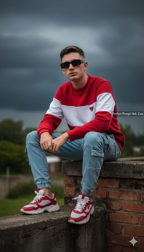 Use this face and create ultra realistic 8k resolution Portrait full-body shot of a young man with fair skin and dark hair, dressed in casual attire, sitting on a ledge. He's Wearing Red White sweet shirt with light blue cargo jogger jeans and red and white chunky sneakers and black Prada sunglasses with a somewhat serious or contemplative expression. The background shows a bright dark cloudy weather and some blurred Greenry and trees, including a brick wall to his right.the man has the same.