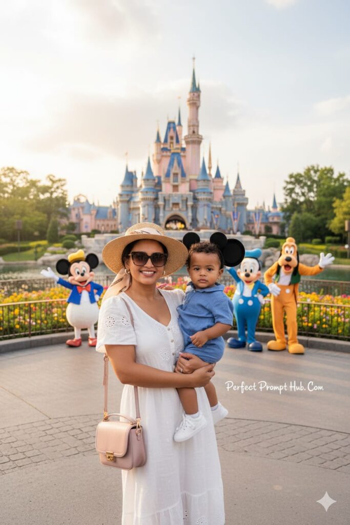 Transform the given photo into an amazing image in which the child and the mother is at a beautiful diseny park with calm atmosphere, Disney cartoon are there with them.. They dress like a luxurious tourist.. Cover every detailed.