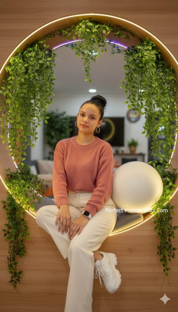 A vibrant indoor lifestyle photo of a young woman sitting in a circular wooden nook on the wall, surrounded by hanging plants and neon lights, with a large white ball as part of the decor. Outfit: Stylish pink rose-colored full-sleeve blouse or chic sweater, paired with cream or light beige high-waist trousers, white Apple Watch, and trendy chunky white sneakers. Accessories can include delicate rings or earrings for a fashionable touch,Don't Change The Face.