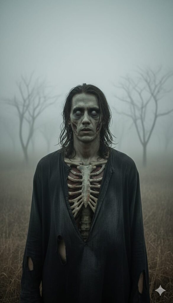 A highly detailed, realistic, and terrifying portrait of a zombie (uploaded image), standing outdoors in a foggy, muted landscape. The creature has sunken, black iris eyes and long, straggly, wet dark brown hair. Its skin is a sickly grey-green, taut over its skull with extreme emaciation. The rib cage is prominently exposed, showing a skeletal chest. It wears tattered, dirty, loose-fitting black-grey rags of a shirt, which is torn open to reveal the bones. The atmosphere is somber, misty, and desolate, with dry, brown grasses in the foreground and blurred, bare trees in the background. Cinematic lighting, high detail, photorealistic, moody, hyper-realistic, 8k. Don't change face and hair style. Don't change face identity.