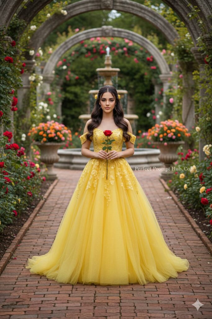 Create a photo of me without changing my facial features, dressed in a flowing, shimmering yellow tulle gown with off-the-shoulder detailing, delicate embroidery, and shimmering fabric, evoking a royal princess look. Her hair is styled in soft, flowing waves, partially tied with a gold ribbon. She holds a single red rose delicately in both hands, gazing at it with serene elegance. The background is a romantic, fairytale garden path lined with lush greenery and blooming red roses. The path is made of antique red brick, leading through a series of elegant stone archways adorned with climbing roses and vines. At the end of the path is a classic stepped stone fountain surrounded by large decorative planters filled with vibrant flowers. The atmosphere feels serene, enchanting, and timeless, like a secret royal garden or a magical retreat hidden within nature. The lighting is natural, highlighting the colors. Looking towards camera