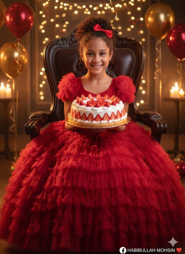 Create the ultra realistic photo of a girl (given photo) in a fluffy red dress sitting on a wooden chair. Holding a large strawberry cake. Attached to a small red bow gift at the hair. Close half-handle camer Soft warm tone lighi. Red gold ballo element on the back. Fill party atmosphere. Bright temperament. Warm happy" "aspect_ratio" 9:16 .