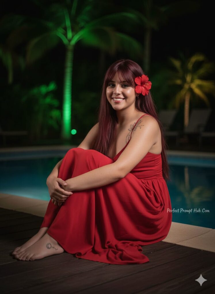 Ultra-realistic 8K night portrait of a young woman sitting gracefully on a wooden deck near a pool, surrounded by tropical scenery. She has long wavy hair with soft highlights, glowing warm-toned skin, and a bright, genuine smile as she looks downward with her eyes closed. A vibrant red hibiscus flower is tucked behind her ear, adding a tropical and romantic touch. She is wearing a flowing red dress with thin straps, the fabric draping elegantly around her legs. She sits with her knees drawn close, arms wrapped gently around them. A delicate small tattoo is visible near her ankle, and add a new tattoo on her upper back shoulder - subtle, elegant, and naturally blended with the lighting and skin texture. Background: lush nighttime tropical environment with palm trees softly illuminated by green ambient lighting. The pool behind her reflects deep blues and soft highlights from nearby lights. The overall atmosphere is serene, warm, and intimate. Lighting: soft artificial night lighting with gentle shadows, subtle highlights on her cheeks and shoulders, and natural sheen on her hair. Style: cinematic tropical mood, DSLR Canon EOS R5, 50mm f/1.8 lens, shallow depth of field, rich color grading, hyper-realistic detail, no watermark, no added text. Make it real face the photo uploaded Looking towards camera