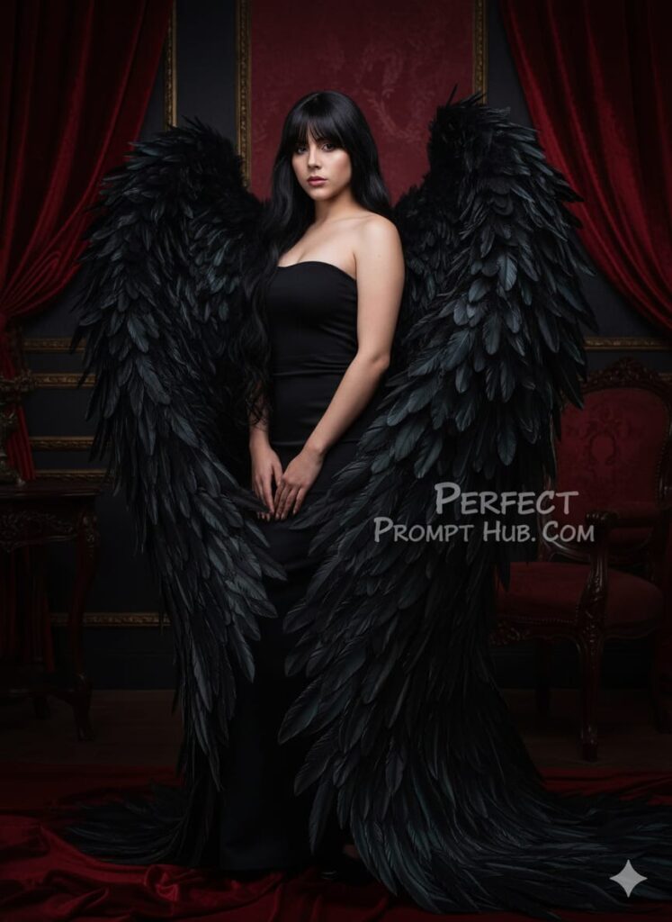 Based on my photo, create A stunning woman with the same face and long, wavy black hair as the model pictured above, unchanged, wearing a strapless black top, posing with voluminous and intricate black feather wings extending from her back and trailing down. Set in a dimly lit, red and black interior with a mysterious, gothic atmosphere, with no stairs or railings visible. Fashion Photography, Gothic Glamour Style. No changes to facial features, no necklace.