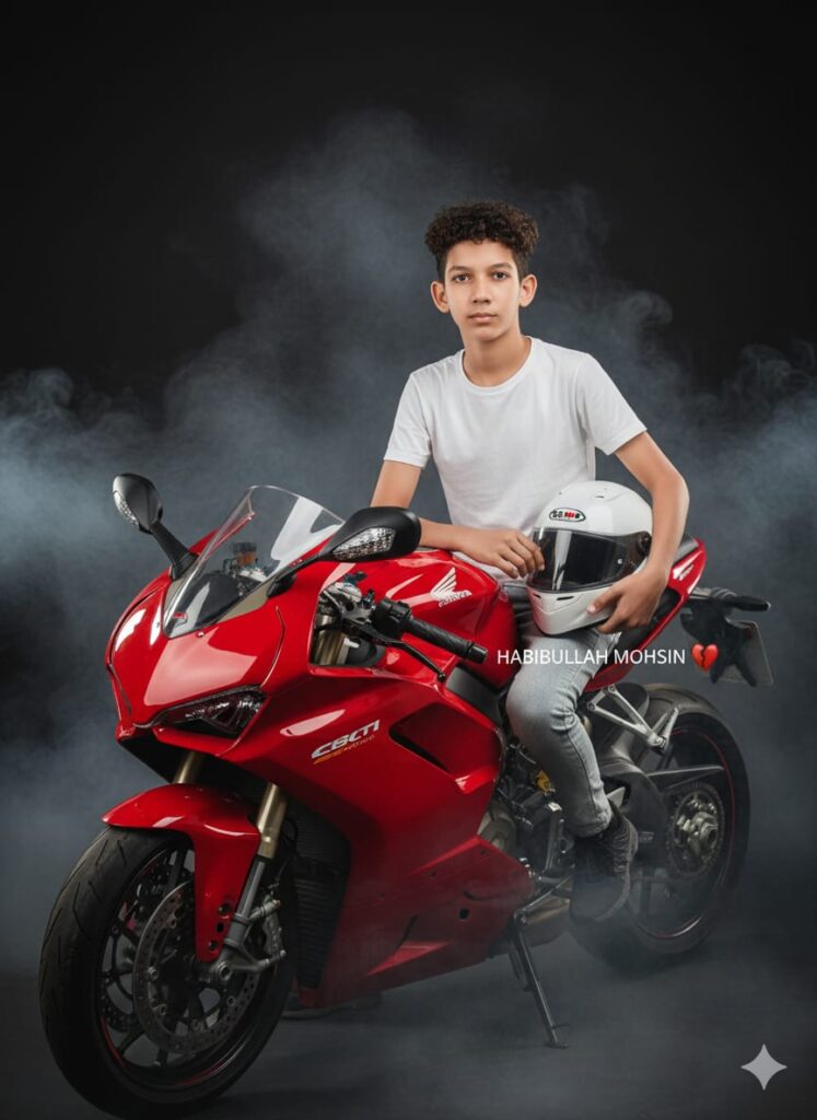 Create a cool 12 year boy from this uploaded photo. He is wearing a white t-shirt and light colored jeans.hes sitting comfortably on a red honda Ducati. he's looking to the front, holding a white small helmet in his left arm. The background has a smoke effect and a bright black studio scene.