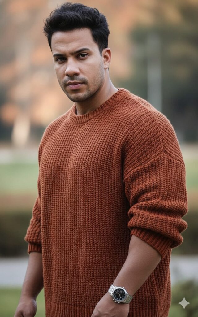 Artificial mind📸: Without changing my facial features, I created a stylish and modern 4k portrait of a super-chubby, 37-year-old plus-size man with the same reference face. He has messy, voluminous hair, wears a rust-colored wool sweater, and a single watch with accessories. The natural background is colorful, soft, minimalist, and subtly blurred to emphasize a cutting-edge, contemporary fashion look. Cinematic lighting, realistic and ultra-detailed textures, and a polished, editorial aesthetic.
