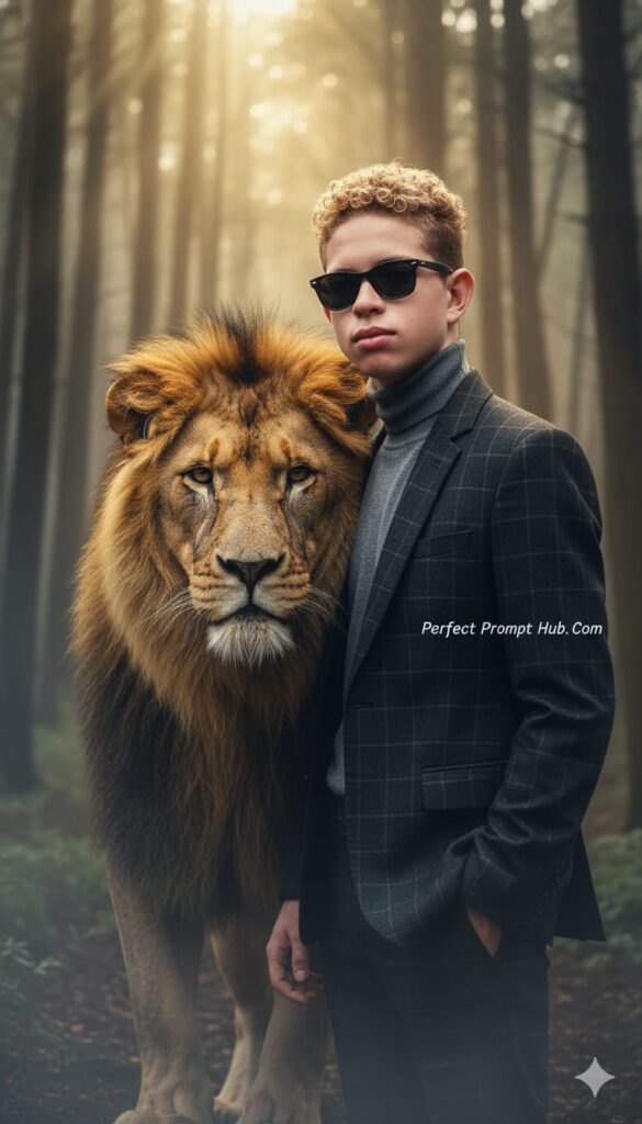 A cinematic portrait of myself wearing sunglasses, a dark checkered suit, and a grey turtleneck. He stands in a misty forest with a majestic lion beside him, their faces close together, symbolizing strength and courage. The lighting is dramatic, soft golden tones with a mysterious atmosphere, ultra-realistic, 8K detail, high contrast, fashion editorial style. (Keep the face same but change the clothes).