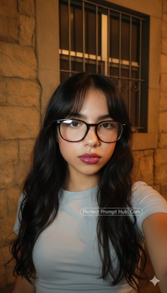 Create a realistic portrait (100% realistic face, no editing required). A 2000s-style photo of a young woman with long, wavy, flowing hair and soft makeup. Her lips are flushed with pink. A beautiful young woman poses for a nighttime selfie, leaning against a marble wall in a city atmosphere illuminated by warm light from the side. She has long, wavy black hair that covers her shoulders and wears a thin, light gray short-sleeved shirt. She wears thick, dark white-rimmed glasses with bangs that slightly cover her eyes. Her face is fair and pink, and her lips are full and shiny, deep pink. A digital camera is in hand, with the flash on. Her face is looking at the camera, sexy. The light and shadows emphasize the facial structure. The background is a stone wall and a steel-framed window, creating a warm, contemporary Korean atmosphere. Shot with a low-quality digital camera, 2000s style, using a direct flash with a soft diffused glow effect, diffused light, slightly overexposed highlights, and a slight graininess. The image has a raw, natural feel and a vintage digital feel. A 4:3 aspect ratio. An 8K editorial fashion photo. A masterpiece. Don't change her face.