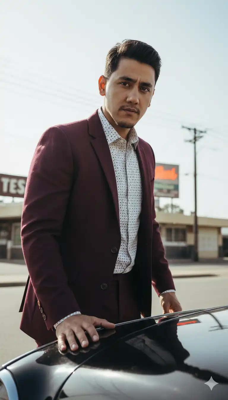 A hyper-realistic 9:16 low-angle portrait of a man in his early thirties, with a face that matches the reference 100%. He wears a 1990s-inspired burgundy suit with a light patterned dress shirt. Shot from a close, worm’s-eye perspective, with one hand bracing against a foreground car edge, creating depth and dynamic diagonal lines. Retro roadside…