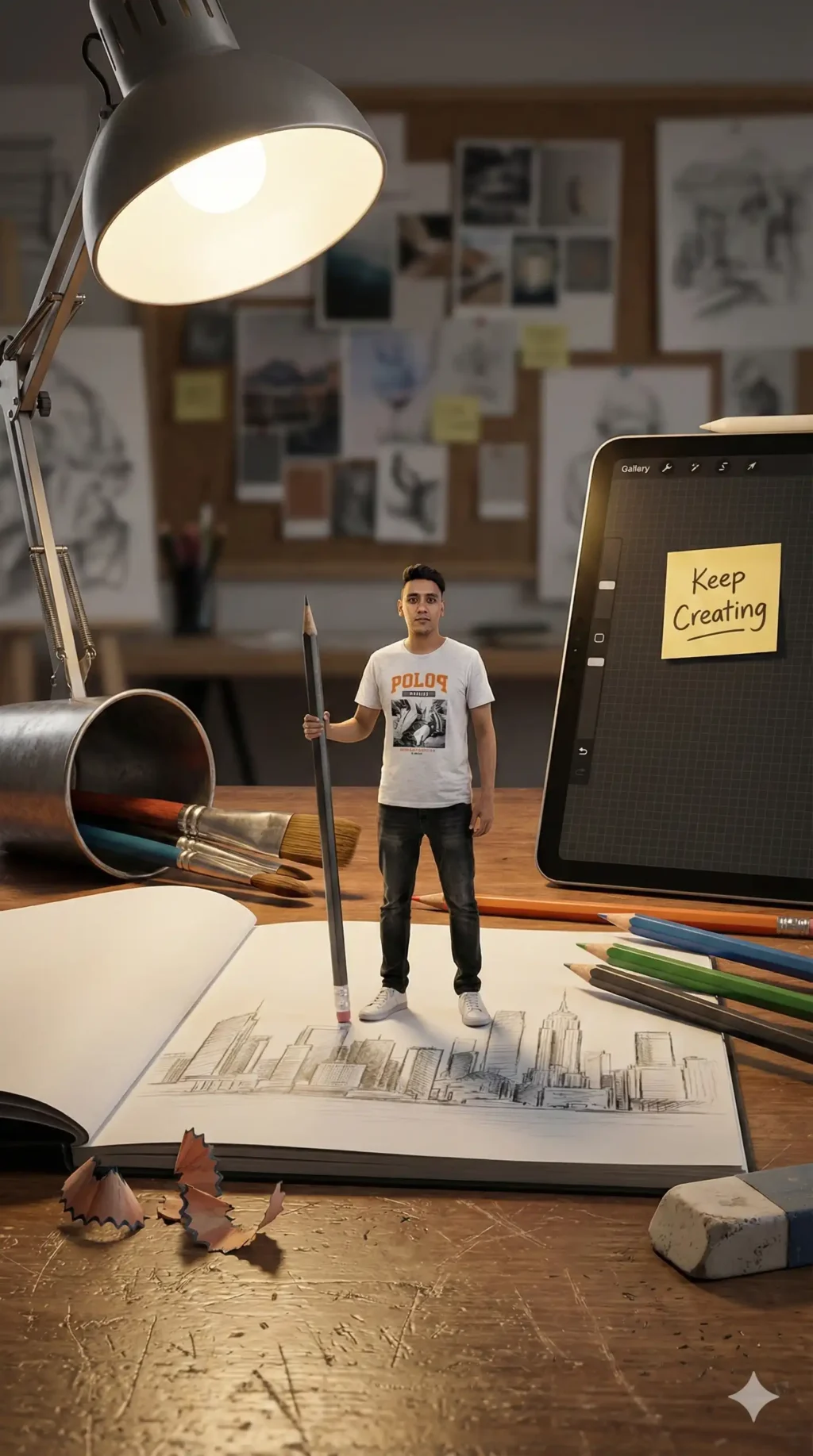 A hyper-realistic 8k medium shot from a slightly low angle captures a surreal creative-studio scene with a shallow depth of field, focusing on a tiny 1:10 scale person with uploaded 100% face as reference. The miniature person stands confidently on top of a giant open sketchbook, surrounded by oversized art tools. He holds a massive…