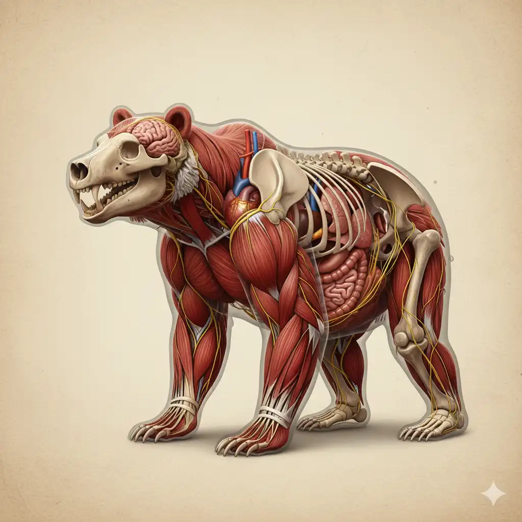 A highly detailed, realistic 3D anatomical illustration of a tiger’s internal structure, presented as a scientific diagram. The image displays a half-transparent view, showing the skeletal system (skull, cervical vertebrae, scapula, ribcage, humerus, femur, fibula, caudal vertebrae), major muscles, internal organs (brain, spinal cord, heart, lungs, liver, stomach), and major nerves (brachial plexus, sciatic nerve).…