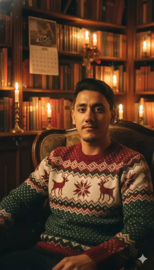 A warm cinematic portrait using Uploaded face 100% as reference. The character sits in an old library decorated for Christmas, surrounded by tall bookshelves, candles, and a vintage 2026 calendar. Outfit is a classic holiday sweater with soft wool textures. Rich warm tones, shallow depth, and calm artistic mood. 200% real.