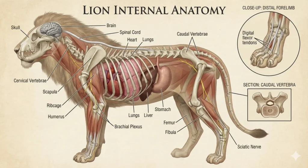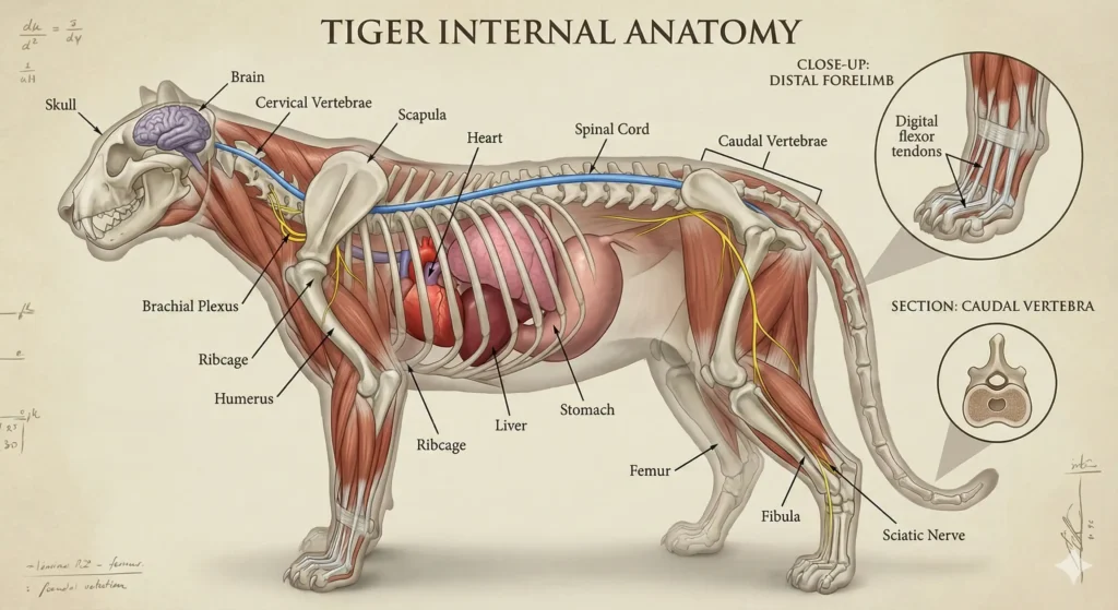 A highly detailed, realistic 3D anatomical illustration of a tiger's internal structure, presented as a scientific diagram. The image displays a half-transparent view, showing the skeletal system (skull, cervical vertebrae, scapula, ribcage, humerus, femur, fibula, caudal vertebrae), major muscles, internal organs (brain, spinal cord, heart, lungs, liver, stomach), and major nerves (brachial plexus, sciatic nerve). Various parts are clearly labeled with text and leader lines, including close-up inset views of the distal forelimb (digital flexor tendons) and a caudal vertebra section. The style is educational and precise, suitable for a biology textbook.