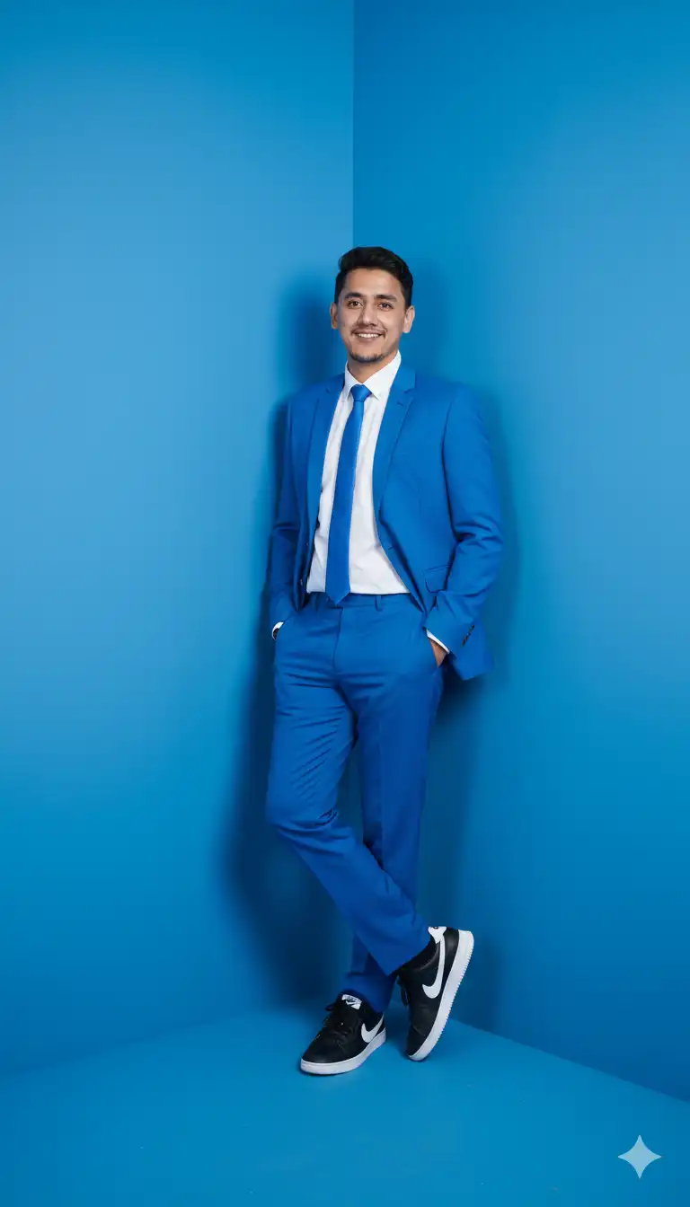 Gemini Prompt: Posing confidently, leaning against a painted wall.