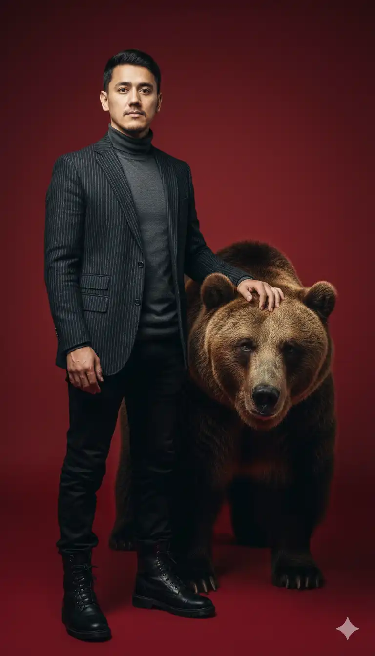 Ultra-cinematic shot of a cool, East Asian man in a stylish, dark suit (or similar sophisticated attire like a turtleneck and blazer) and combat boots, standing with a massive brown bear slightly behind him, with his hand resting on the bear (bear looking towards camera). It's clear that the bear is his protector and his loyal, trained friend. Ultra-detailed photo in Russian style. Dramatic directed lights, minimal environmental immersion, solid red background. The image exudes boldness and a feeling of calm atmosphere.