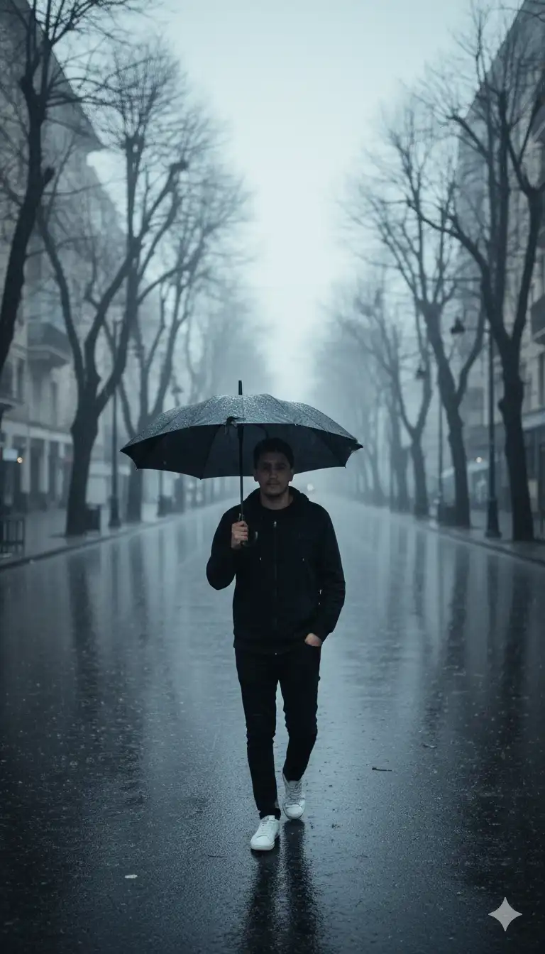 Took this photo without changing the face, create portrait of a medium-to-full-length man walking alone on a wet city street during a rainy day, shot from a distance of about 3–4 meters with a focal length of 50–85 mm for a natural portrait perspective. He holds a large black umbrella over his head, dressed all…