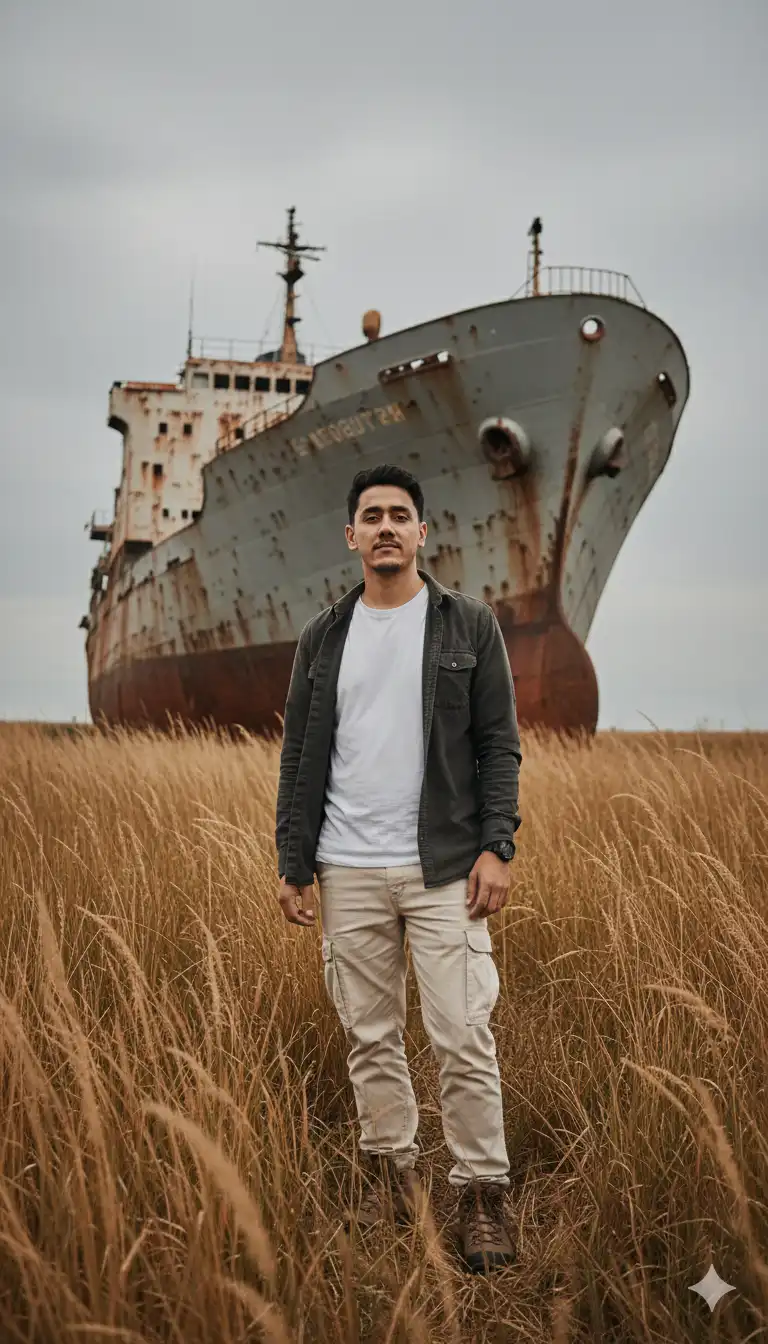 Ultra realistic cinematic low-angle full-body photo of a man standing close to a massive abandoned ship. The ship looms directly behind him, rusted and weather-worn, filling the background. The man stands among tall dry grass in the foreground, clearly in sharp focus while the grass near the lens is softly blurred, creating shallow depth of…