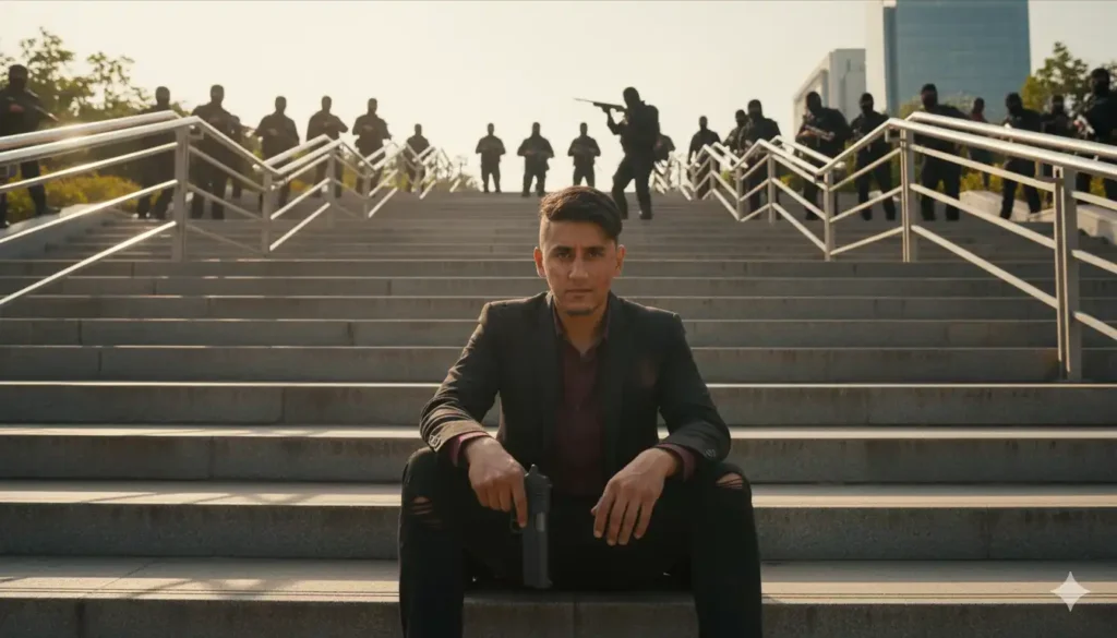 Create Photorealistic cinematic shot of a young man (give photos), sitting tiredly on a large, modern outdoor concrete staircase with three layers of luxury flat metal railings in an urban park. He was obviously injured, his dark suit was dirty and ripped. He got the gun tight in his right hand. Looking forward with intense…