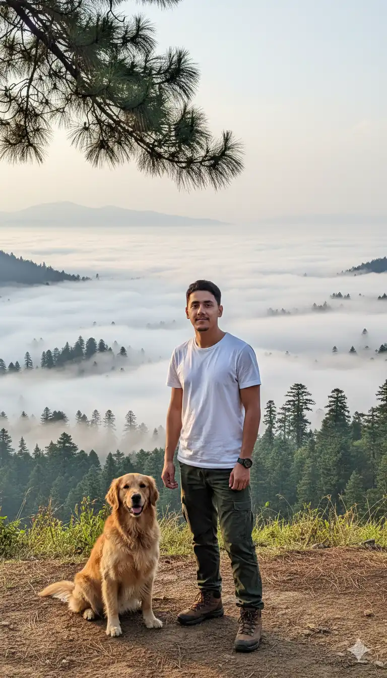 Using the image I uploaded, I kept the face and hair exactly as they are in the reference image. This is a portrait of a young man standing on a mountain path overlooking a dramatic, misty valley. The setting is a natural highland landscape, likely a mountain or large hill, in the early morning or…